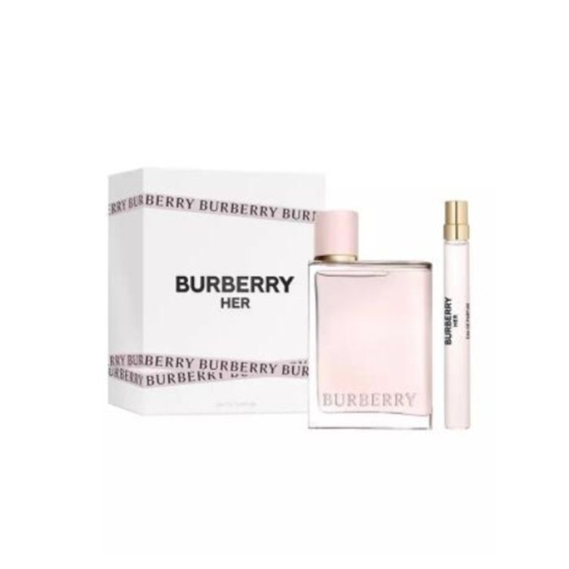 Burberry Her Eau de Parfum is a gourmand perfume featuring a medley of berries, elevated by jasmine and violet, in a glass bottle with pink cap and gold detail. Set includes:- 3.3 oz Eau De Parfum, 0.33 oz Eau De Parfum