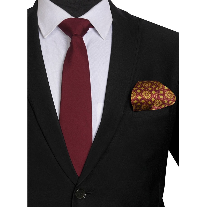 Rich, Pure Satin Silk, Burgundy color solid tie. Paired with a Burgundy & Lemon Green pure silk pocket square inspired by Indian designs. For the complete look. Great with a Black or Grey Jacket. Suitable for formalwear, casualwear and occassions. Elegant packaging for gifting.