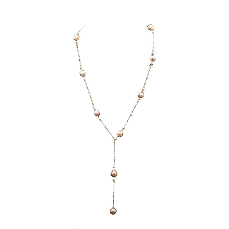 Introducing one of our most admired pieces of jewelry, a drop necklace with beautiful water pearls! The necklace is designed to be long, making it a versatile accessory that can be worn with any of your outfits. The pearls used in this necklace are natural and have a beautiful luster and shine. These pearls are arranged on a gold-plated link chain at some distance from each other, giving the necklace a clean and sophisticated look. What makes this necklace more special is its quality and elegance. The long length of this necklace allows the pearls to cascade down your neck, creating a beautiful and eye-catching effect. So whether youre dressing up for a formal event or keeping it casual, this necklace is sure to make a statement.