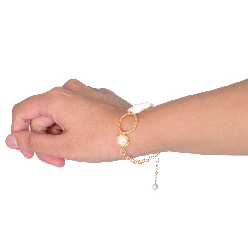 Introducing you to our bracelet that is no less than a magical piece- Geometrical Baroque Bracelet with Golden Linkchain! This bracelet is a perfect blend of classic and modern design, featuring natural baroque water pearls in geometrical shapes. The pearl