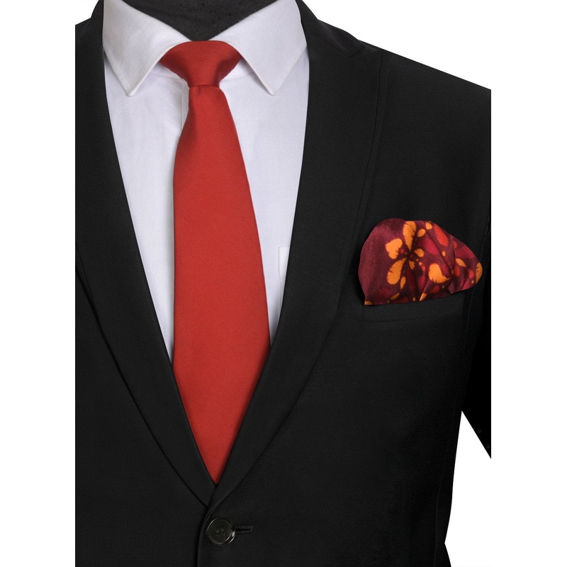 Rich, Pure Satin Silk, Red color solid tie. Paired with a Burgundy floral print pure silk pocket square inspired by Indian designs. For the complete look. Great with a Black or Grey Jacket. Suitable for formalwear, casualwear and occassions. Elegant packag