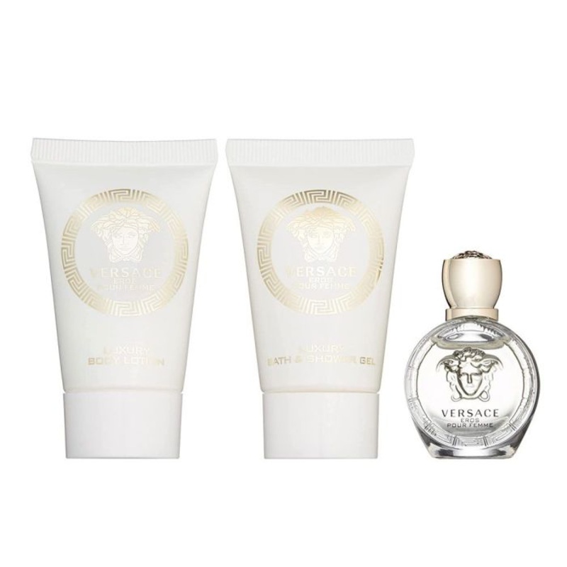 Versace Eros Pour Femme 3 Pieces Mini Set includes:- Eau De Parfum Spray, Shower Gel & Body Lotion. Manufacturer Versace Gender Women Special New Arrivals Perfume Type Eau De Parfum Sizes Standard