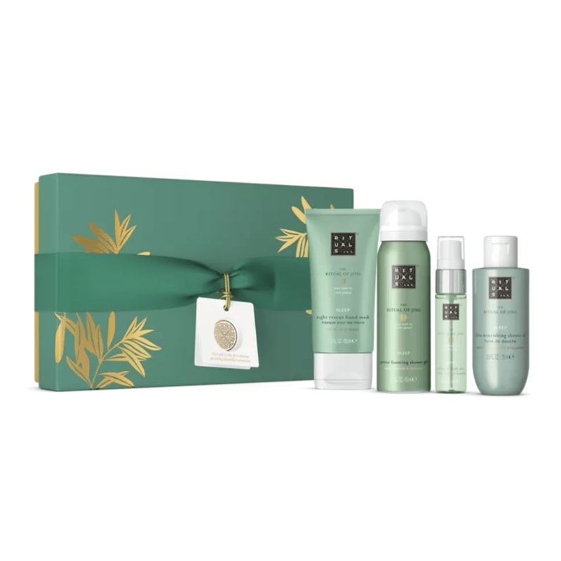 About The Product:Discover tranquillity with the Rituals The Ritual of Jing Small Gift Set. This four-piece collection includes a 50ml shower gel, 75ml shower oil, 50ml hand mask, and 20ml body mist, each infused with calming scents to promote relaxation.