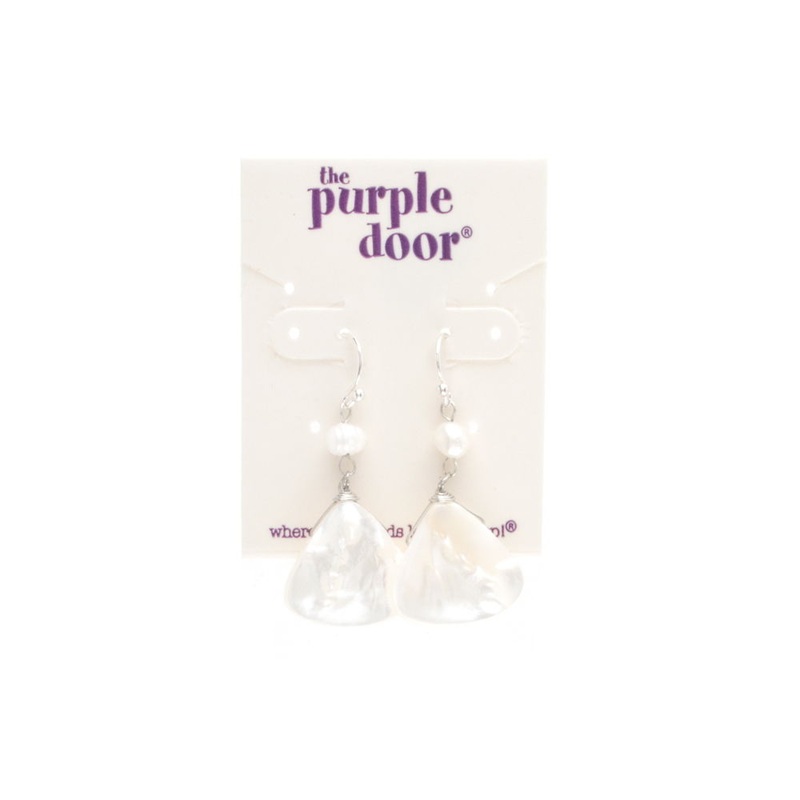 Mother of pearl shell, freshwater pearl, crystal and silk thread. Earrings on sterling silver hooks.