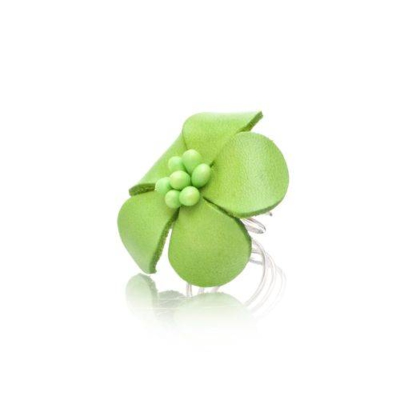 Colored leather on adjustable rings made of a rhodium plated band.